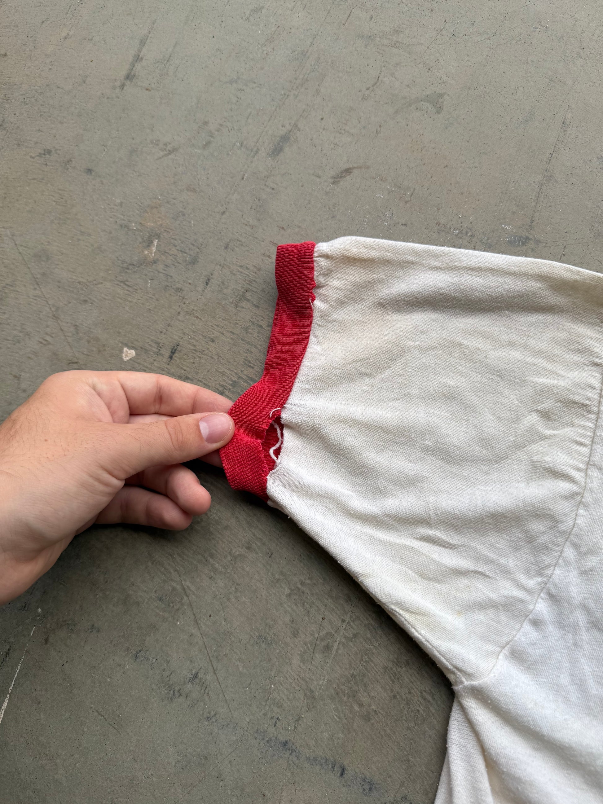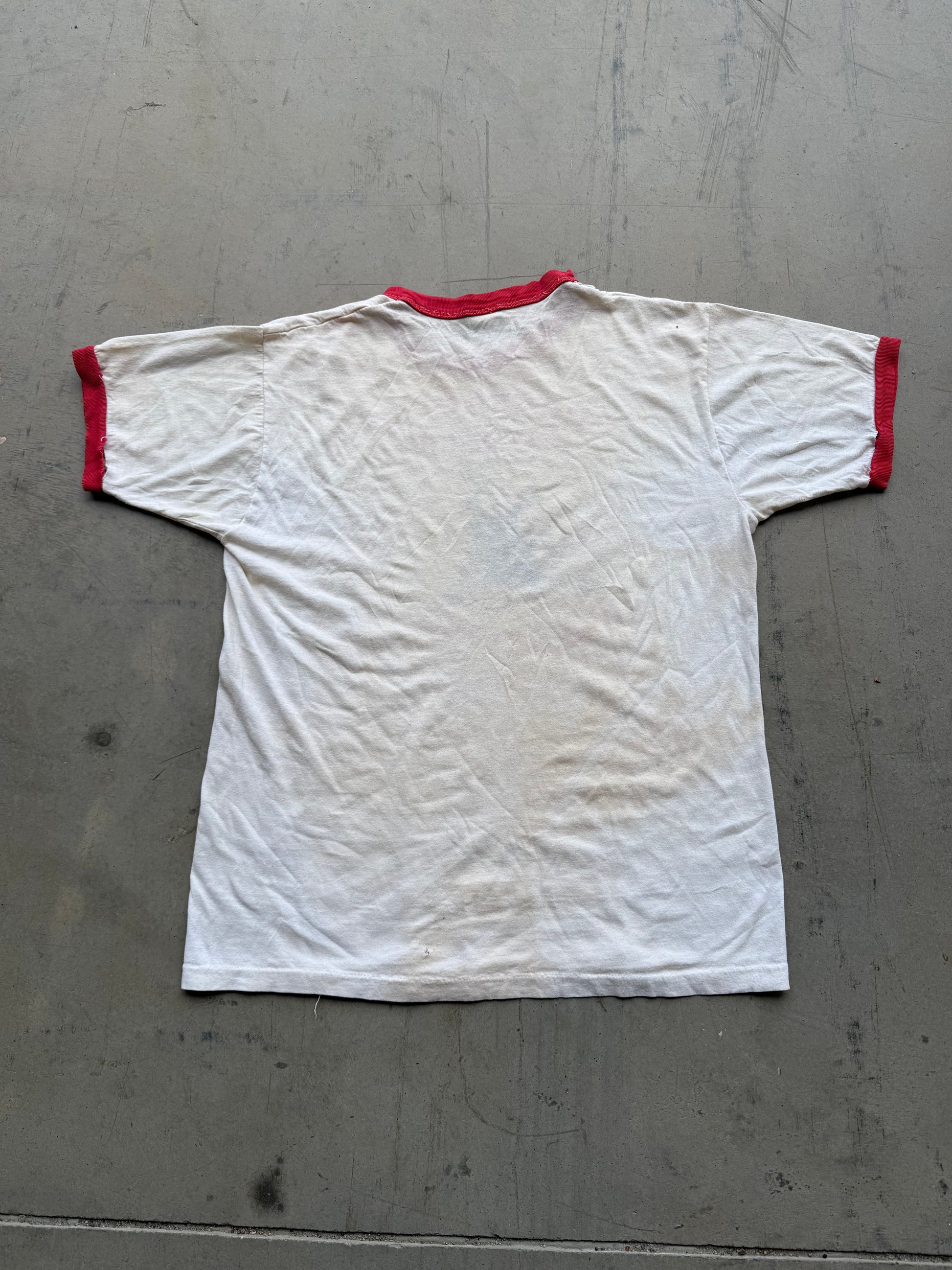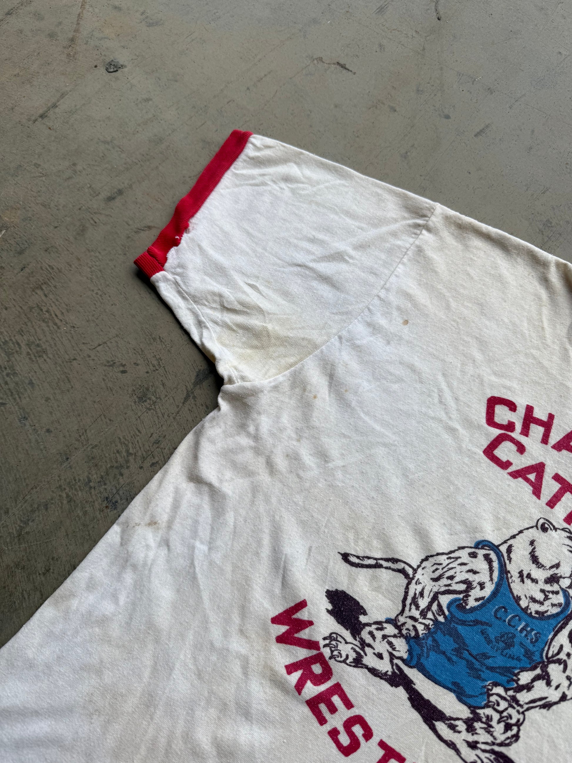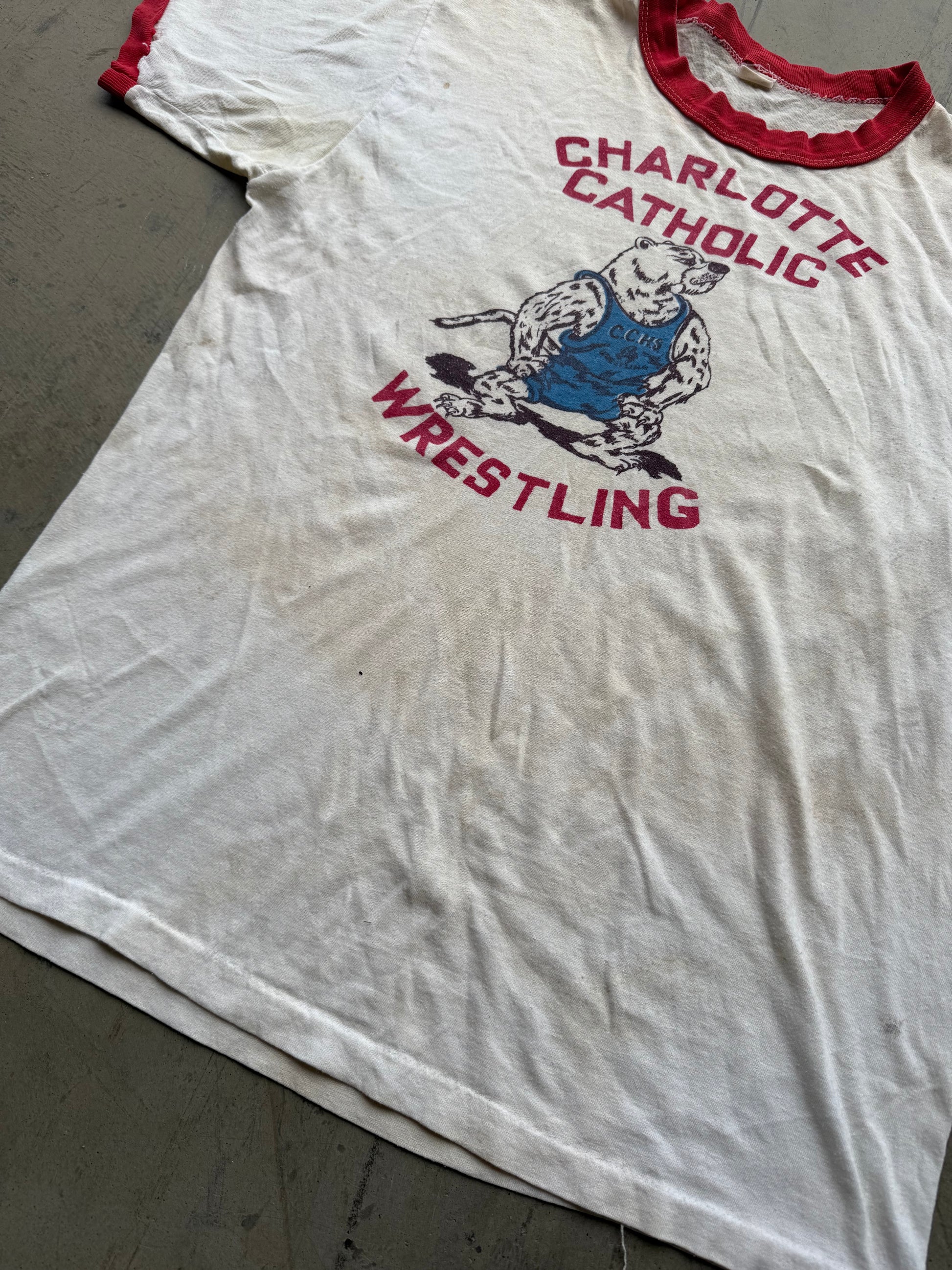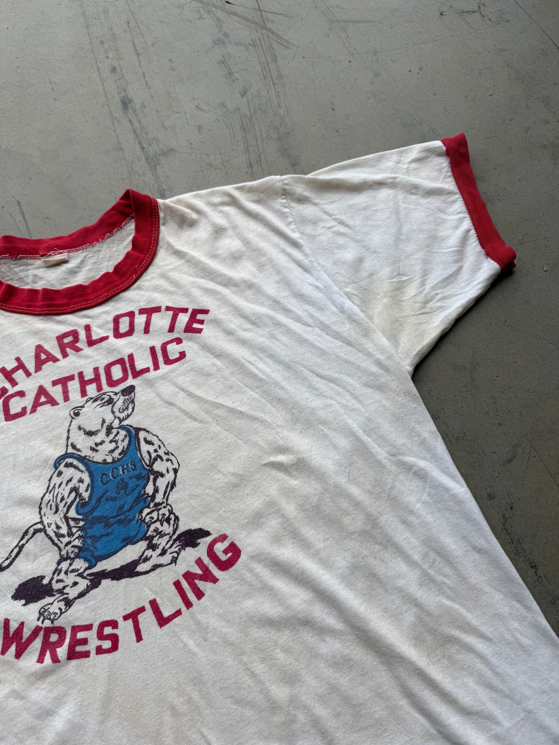 Vintage 70s Charlotte Catholic Wrestling Mascot Ringer Tee ( Medium )